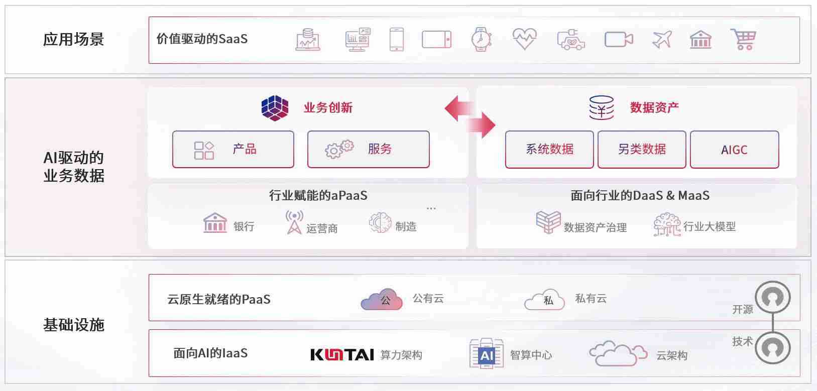 数字时代,,,围绕企业数字化转型的关键要素,,,,TOP1体育数码开创性的提出数云融合战略和技术体系框架,,,着力在云原生、、、、数字原生、、、AI原生和信创产业上架构产品和服务能力,,,为处在不同数字化转型阶段的快消零售、、、汽车、、金融、、、、医疗、、政企、、、教育、、、、运营商等行业客户提供泛在的敏捷IT能力和融合的数据驱动能力,,构建跨界融合创新的数字业务场景和新业务模式,,,,助力企业级客户建立面向未来的核心能力和竞争优势,,,全面推动社会的数字化、、、、智能化转型升级。。。